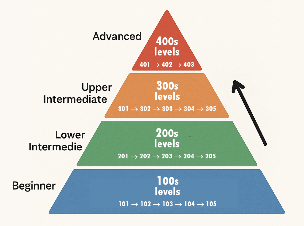 Each step builds on the one before it. For example: 101 → 102 → 103 → 104 → 105. Then you move on to 201, and so on!