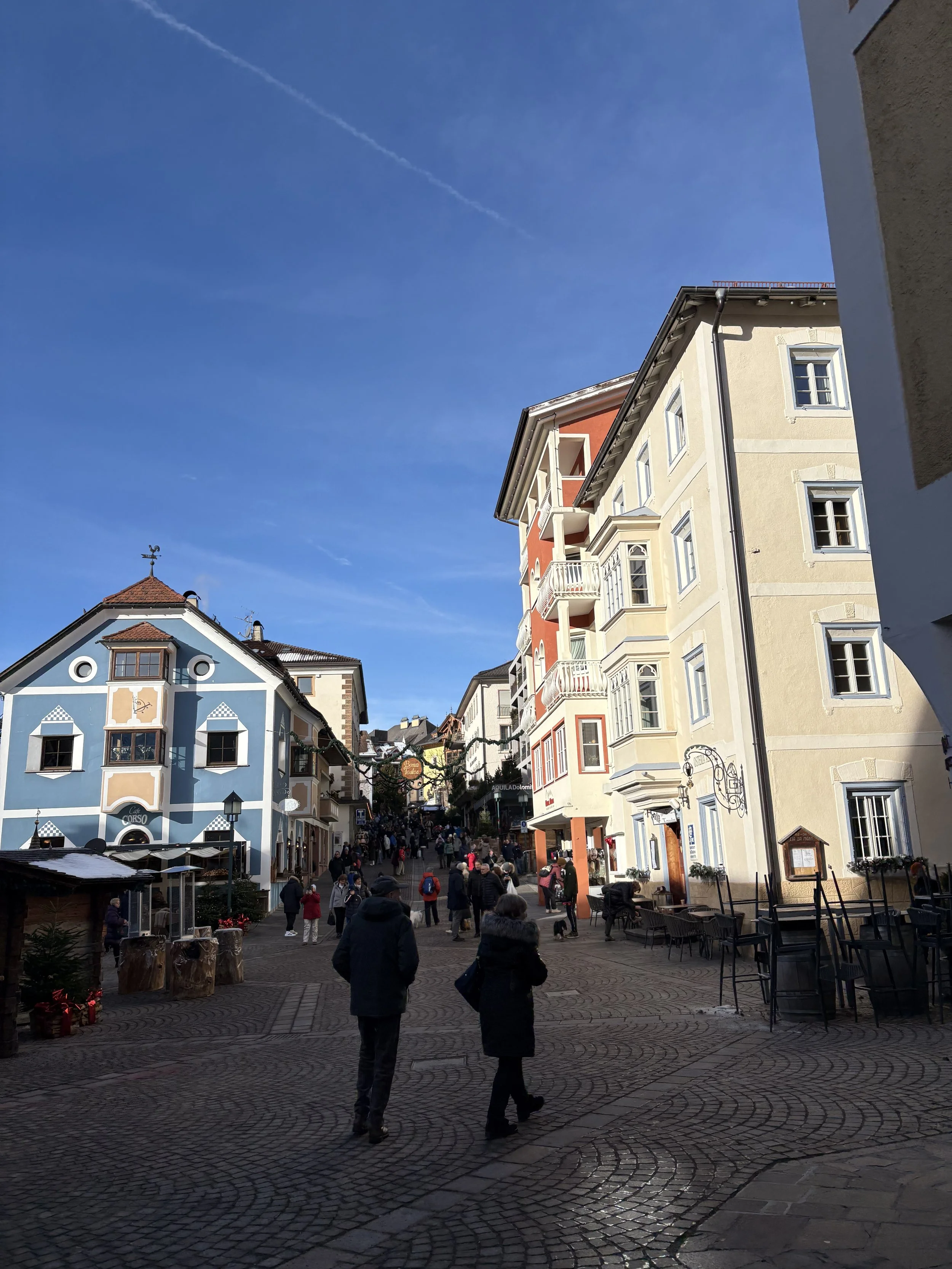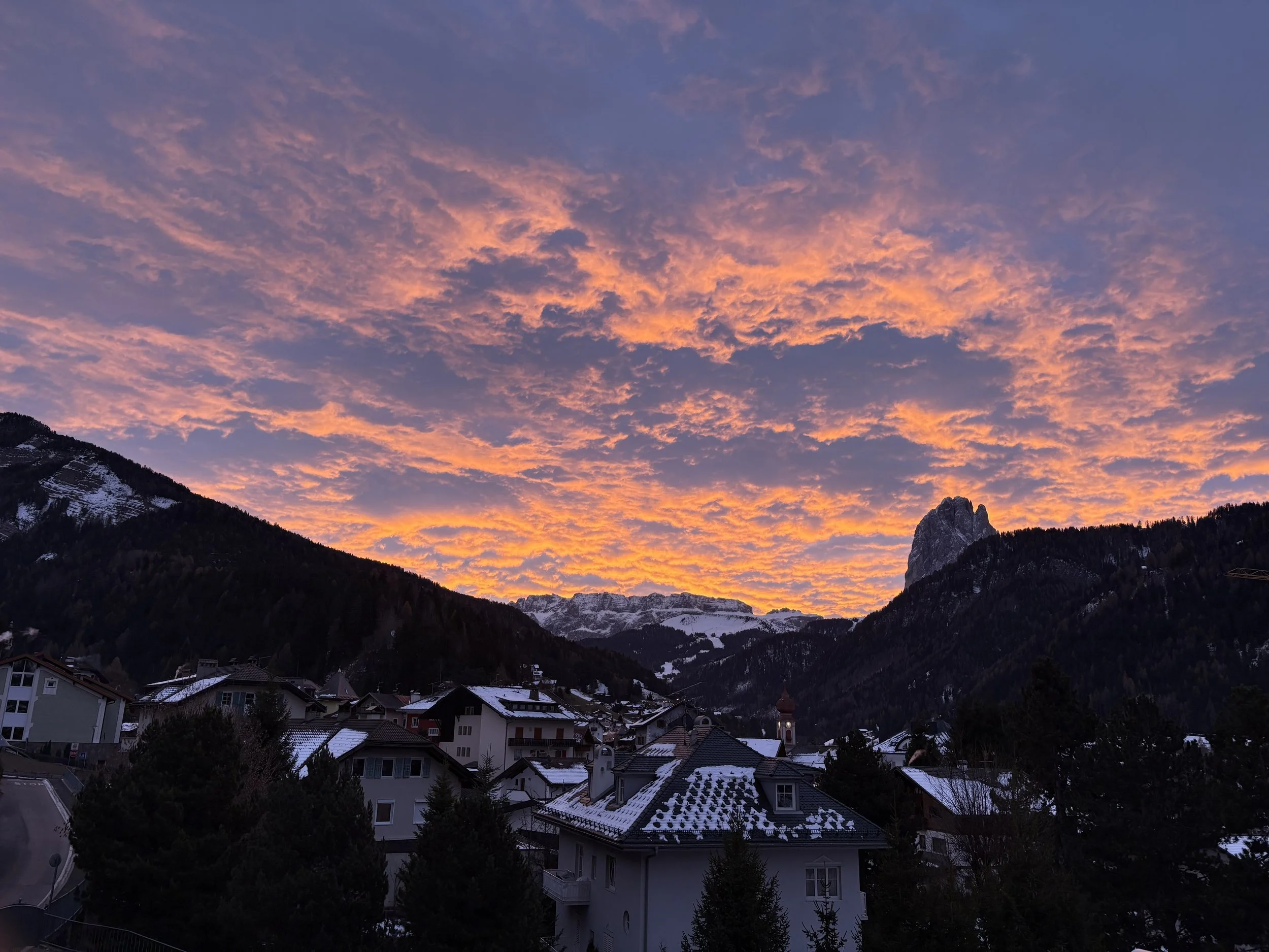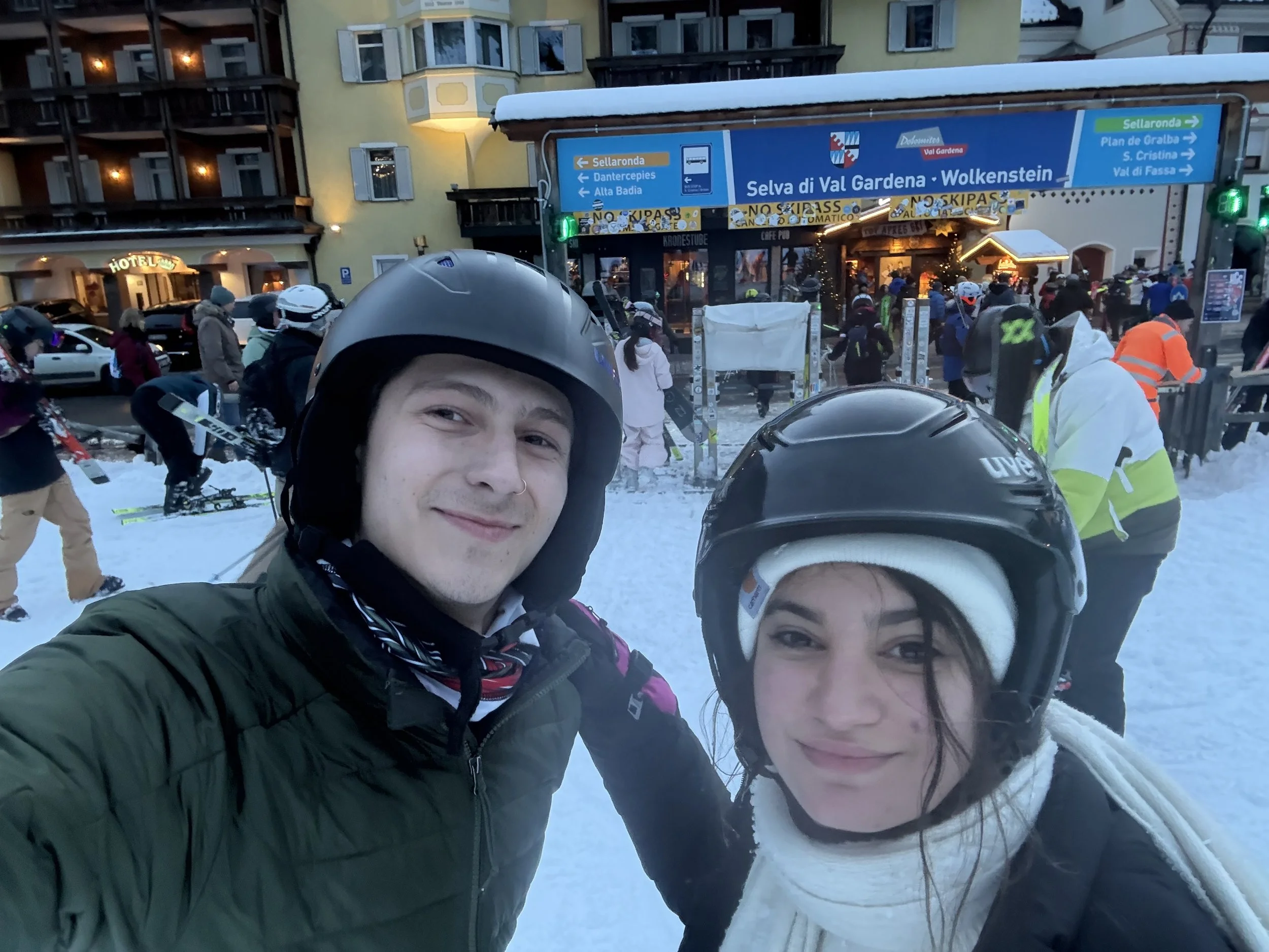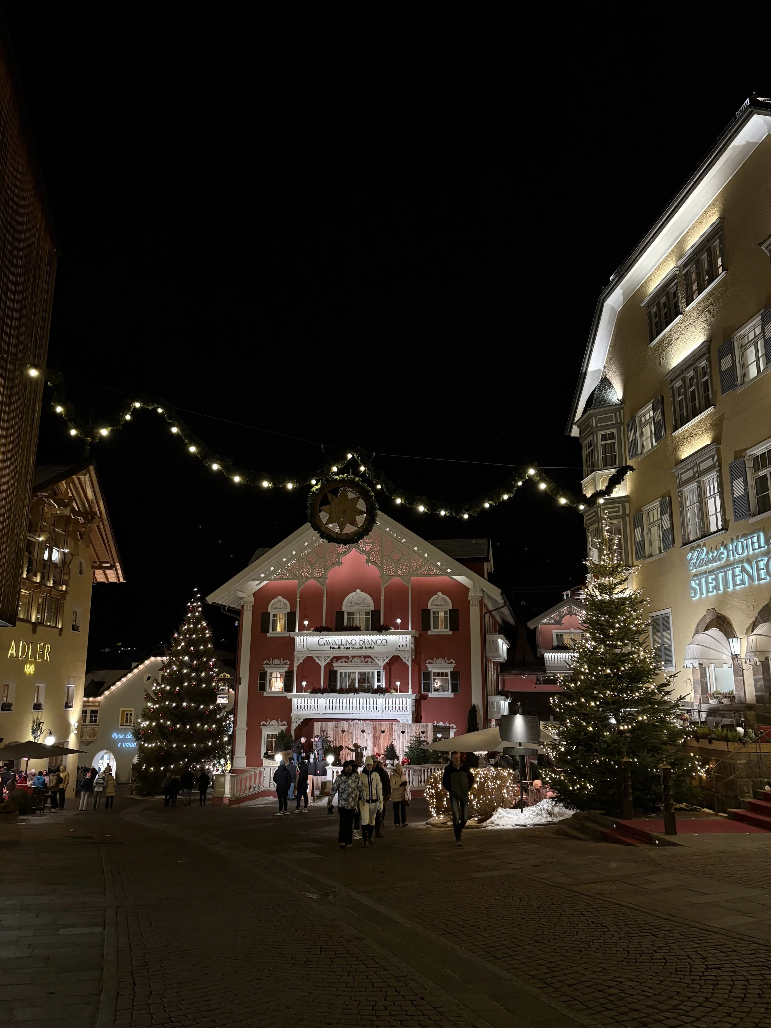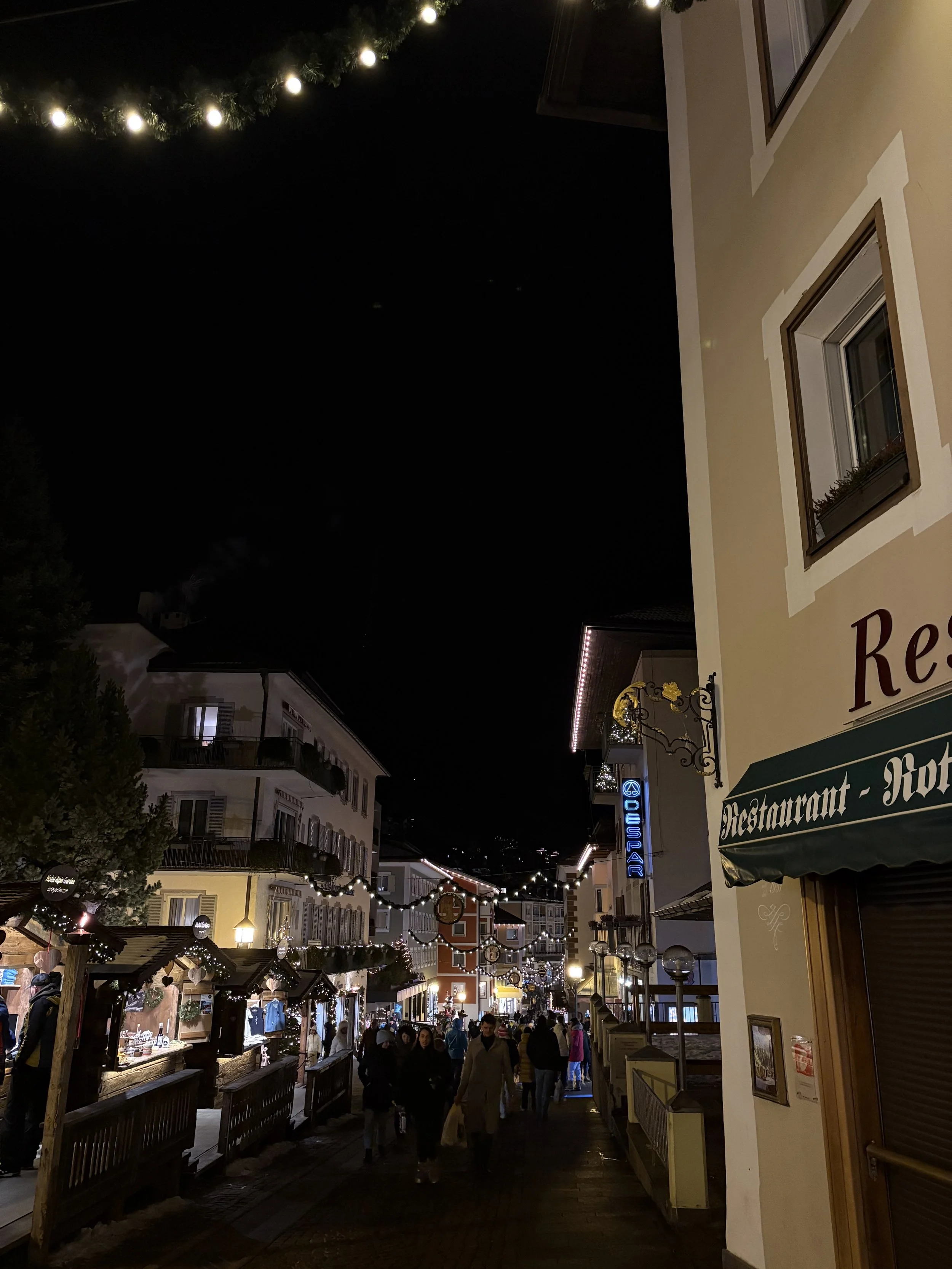 That night, we met up with our larger group to traverse the town of Ortisei and have some dinner. The town completely turns into a Christmas village in wintertime, with trees, festive lights, and thin, winding streets on an incline. Although Ortisei is in Italy, the architecture doesn’t feel Italian, but instead more German or Austrian. In conversation with some locals in the area, I learned that this is because, before World War I, South Tyrol was a part of the Austro-Hungarian Empire. Today, South Tyrol is an autonomous province (one of only two) in Italy, and North Tyrol is a part of Austria. Because of that, the architecture is so Austrian, and the people speak Italian, but also German and Ladin, a local language. This was fascinating to learn, but it’s very clear when you’re in this region that there are some outside-of-Italy influences. Even road signs are in both German and Italian.