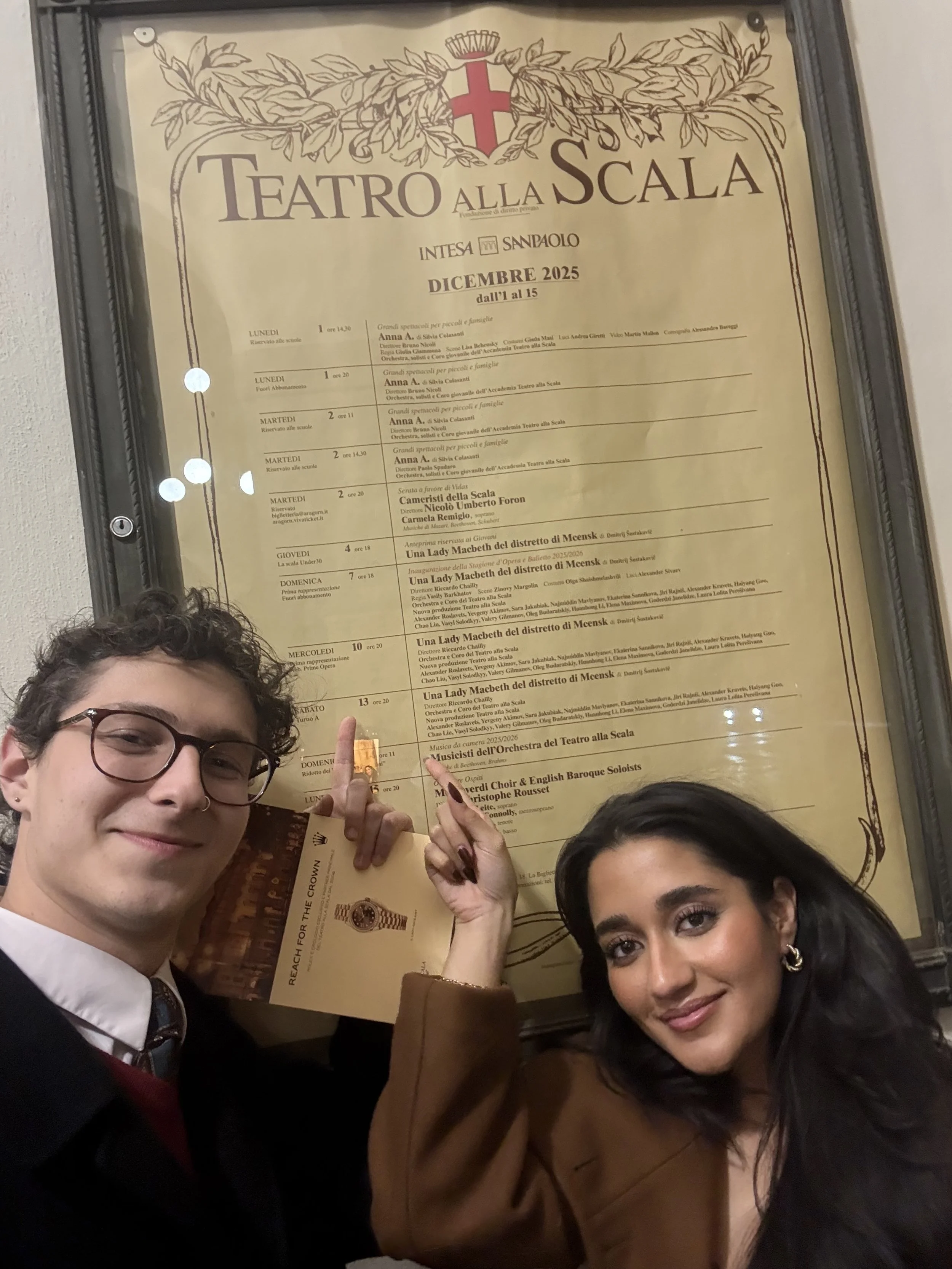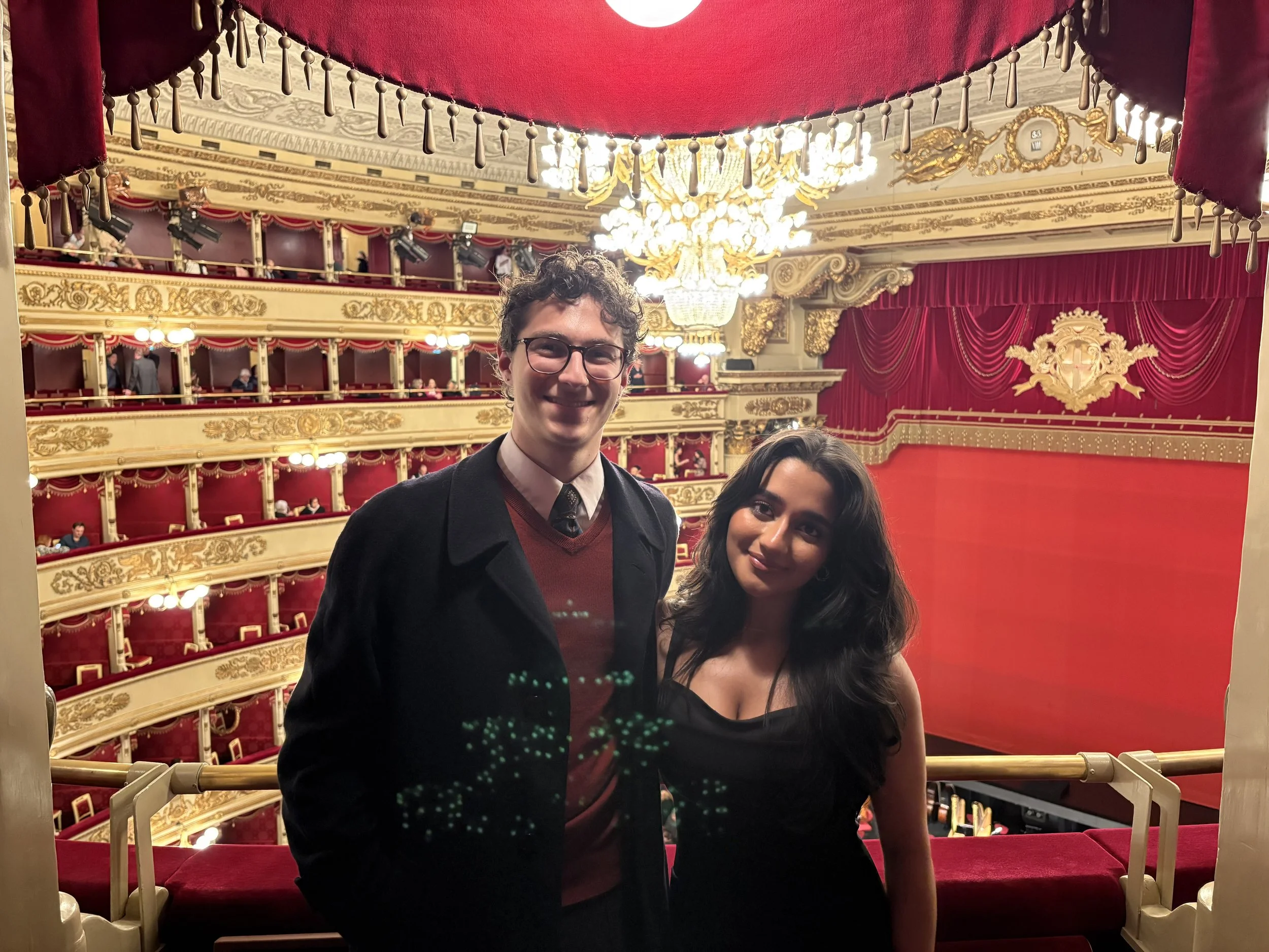 Between exams, I’ve had the opportunity to explore and have moments of fun in Milan. To celebrate being done with our first exam of finals, a friend and I went to La Scala to see an opera since we had heard glowing reviews about the performances there. We got tickets to see Lady Macbeth of Mtsensk, which I found out upon arrival is different from Shakespeare’s Macbeth. The atmosphere of the opera immediately put us in a good mood, with attendants dressed very nicely and ushers dressed seemingly in accordance with the show. I immediately heard a variety of languages spoken, which let me know people bought tickets from across Europe and the world to see this performance. The physical space is no less impressive, with velvet, gold, and white making up the stage, seats, and chandelier.