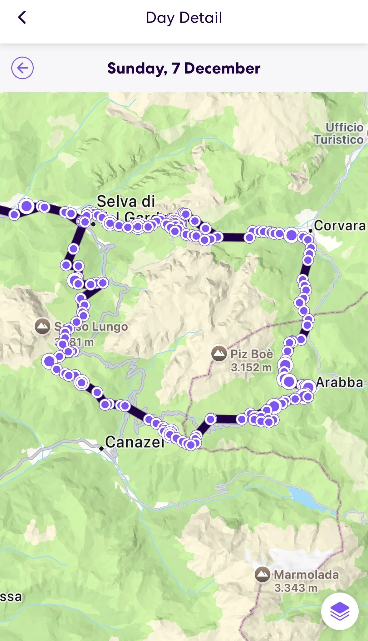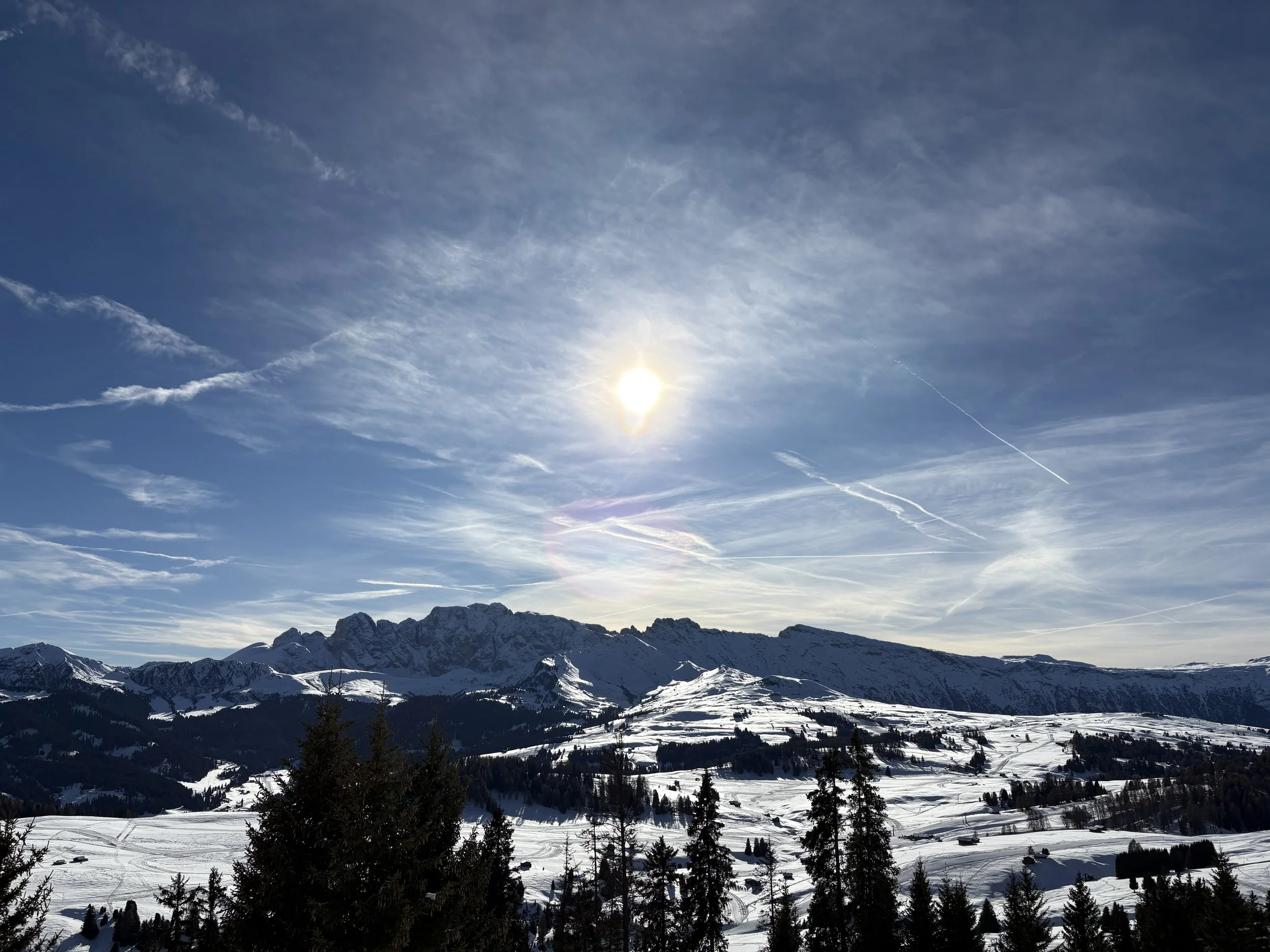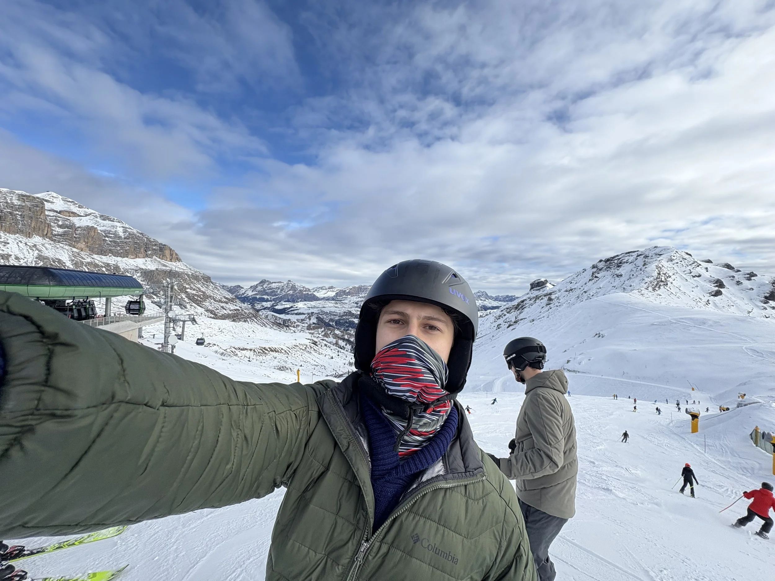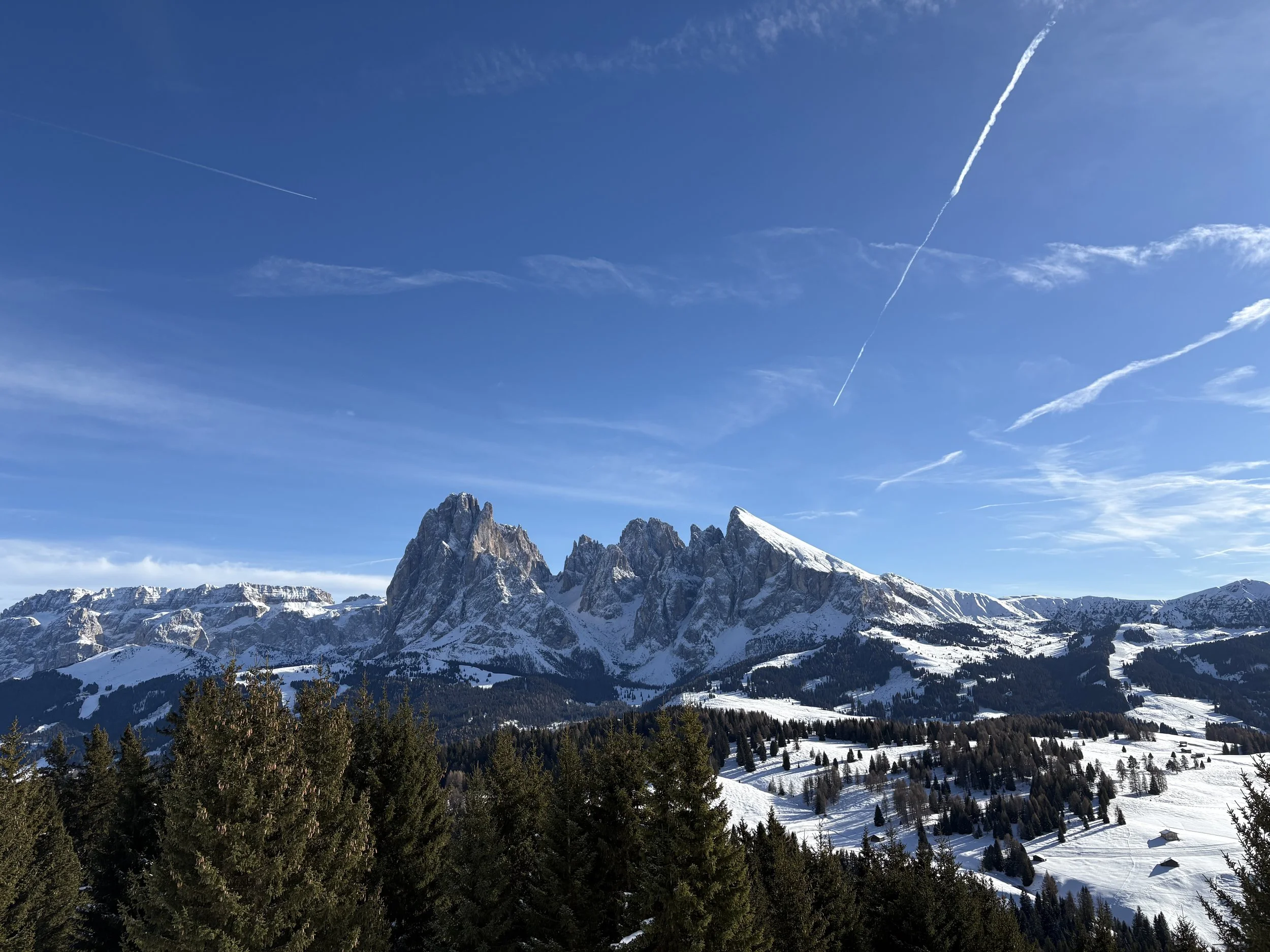 The next day was the most important of this ski trip because we were driving to Selva, a nearby town, to start the Sellaronda. The Sellaronda is a ski circuit in the Dolomites that goes around the Sella group, an iconic mountain group in the Dolomites. It covers about 25 miles of distance, about 15 of which are ski slopes and the rest are lifts. The loop goes through three Italian provinces: South Tyrol and Trentino in the Trentino-Alto Adige region, and Belluno in the Veneto region. The whole loop takes around six hours to complete, but we took a little longer because of our level of skiing. I had hoped to go to the Dolomites for hiking in October, and when that became impossible, I learned about the Sellaronda and made it my goal to complete it.