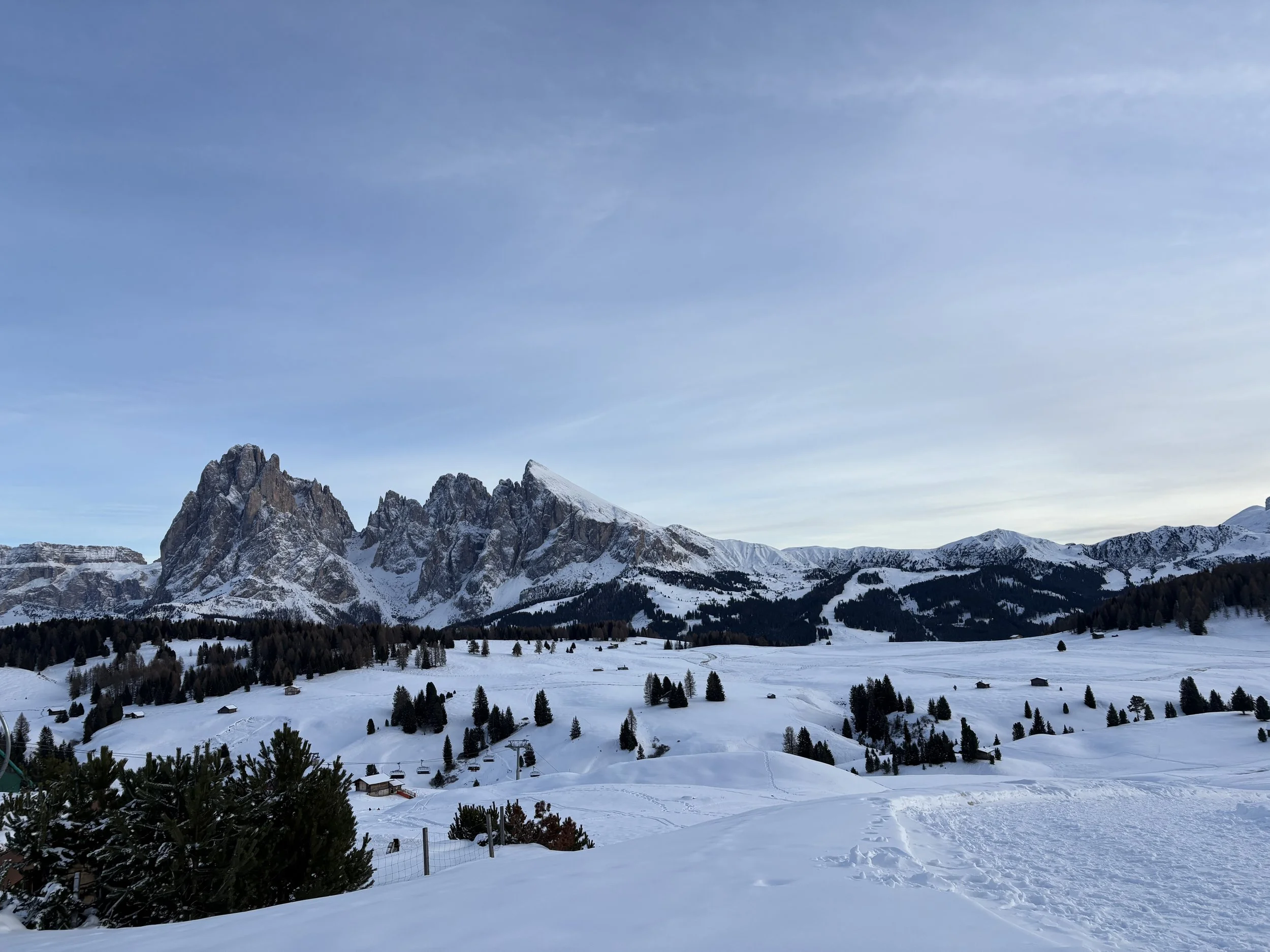 Still, it didn’t compare to getting to see the full extent of the mountains during the day. In the morning, one of my friends with ski experience and I went to rent ski equipment and took the Alpe di Siusi cable car lift up to the ski area there. Immediately stepping out of the lift, the scenery felt completely different. From where we started, I couldn’t see any of the villages below, but instead only the ski lift, a restaurant at the top, and the vastness of snow and mountains in front of me. The only true mountain I had ever seen before was in the Adirondacks in New York, which does not compare to the Dolomites in the slightest.