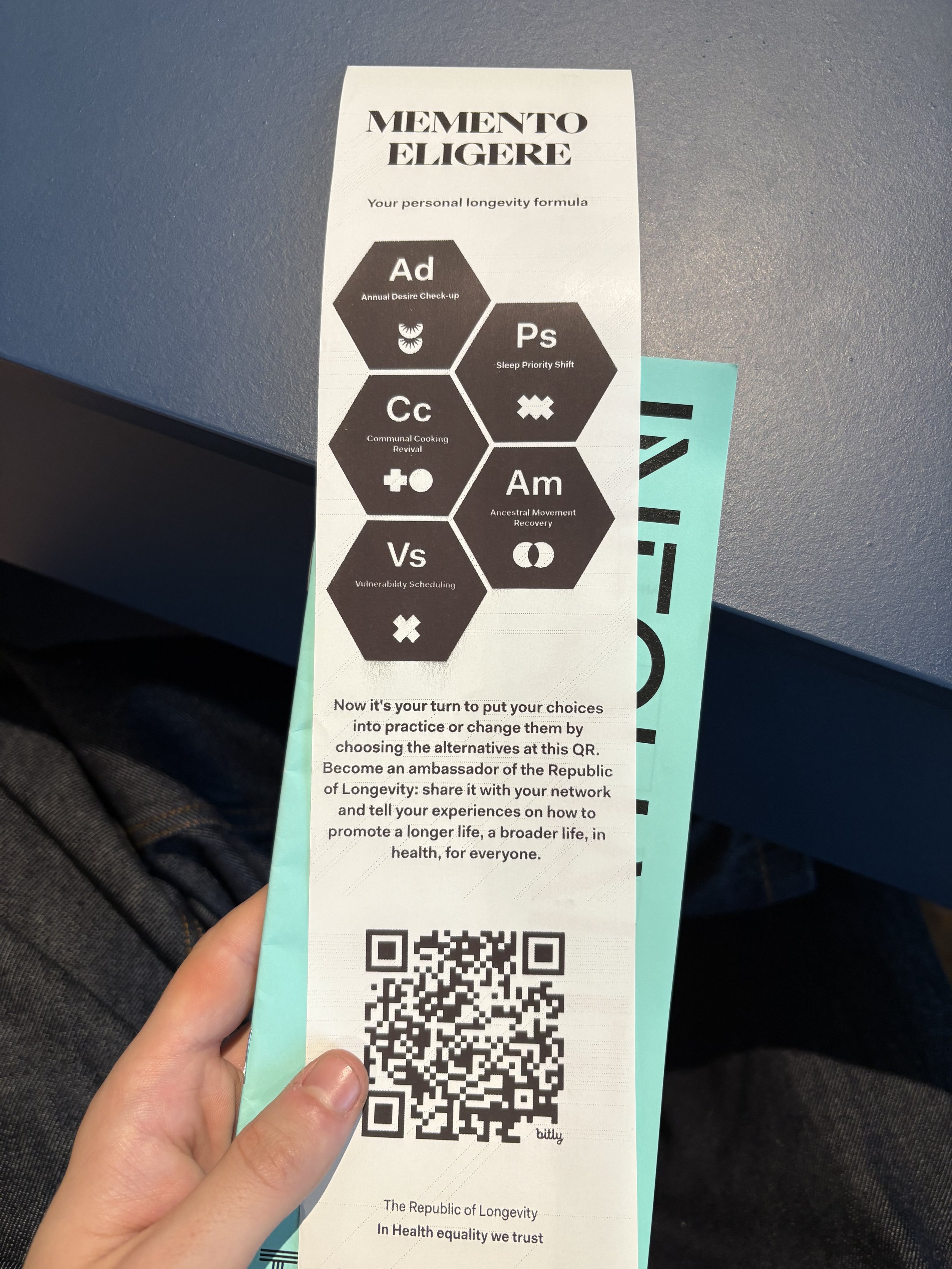 Another that comes to mind is an exploration into longevity through five ministries – purpose, sleep equality, food democracy, physical freedom, and togetherness. On top of the art for each ministry, there was a computer program that allowed me to personalize a ‘life framework’ for each of these ministries and print a small souvenir of my choices.