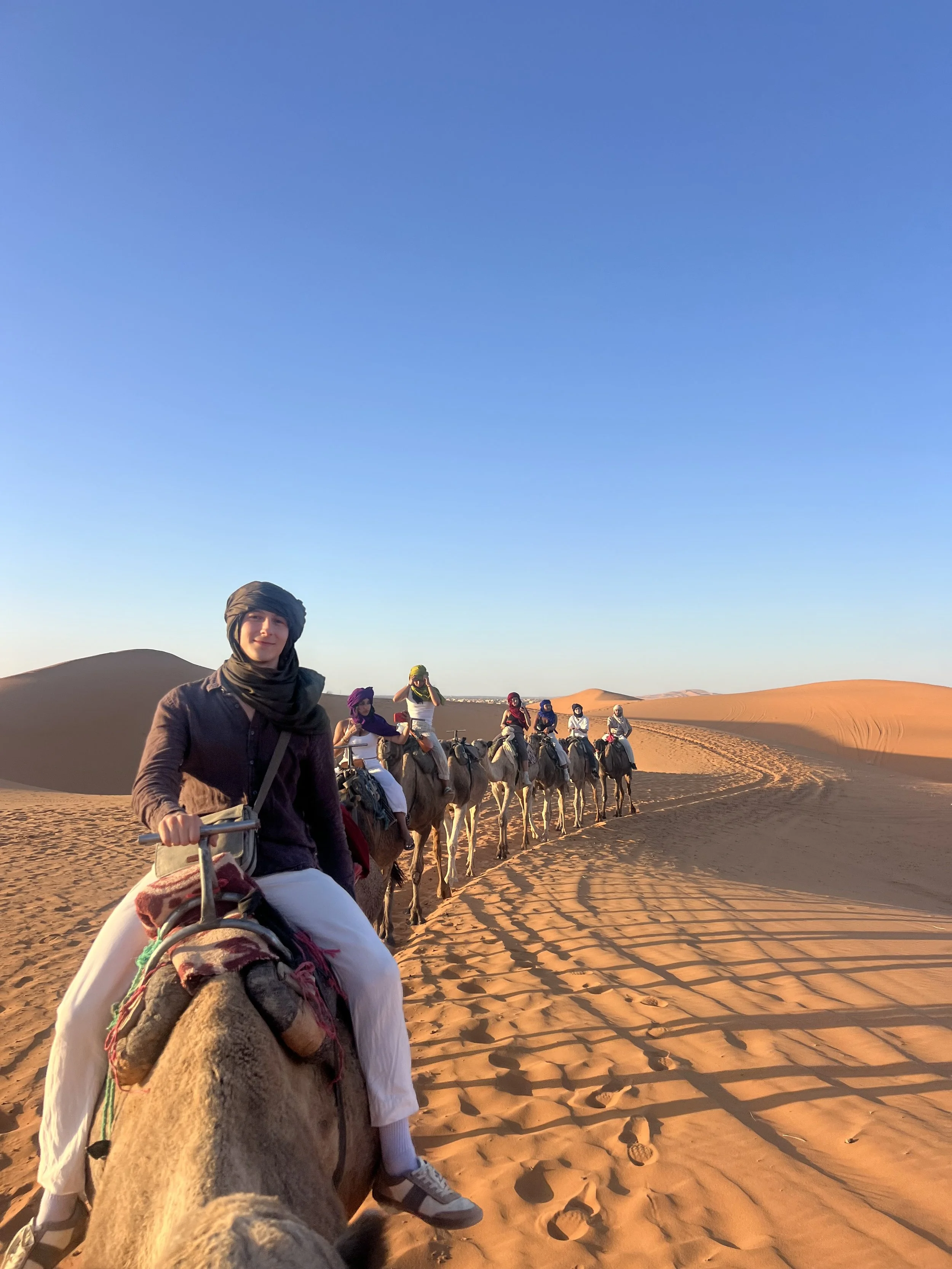 Afterwards, we continued toward Erg Chebbi, a large area of sand dunes near the Eastern border with Algeria. We were fortunate enough to get to ride camels through the sand dunes and watch the beautiful sunset. By nightfall, we arrived in Merzouga, a village among these sand dunes, where we spent the night. This area has light pollution levels similar to those of Death Valley, so the sky was incredibly visible. Milan and Philadelphia, being the large cities they are, stargazing is a near impossibility, so this was a shocking and incredible reality. We spent a good chunk of the night watching the sky and seeing several shooting stars. The next day was full of lots of travel, starting with driving ATVs through Erg Chebbi to the area we started in, and then taking our long drive back to Marrakech.